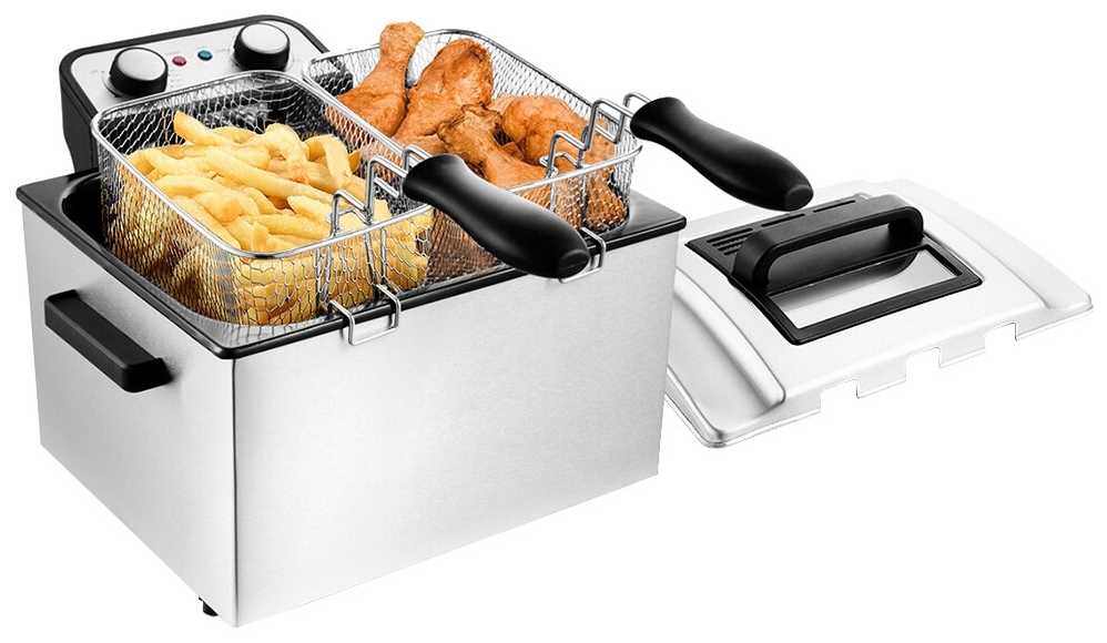 Эта вместительная фритюрница укомплектована сразу тремя сетчатыми корзинами.
