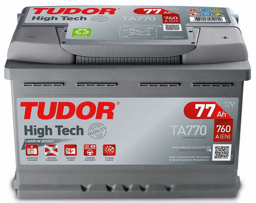 - Tudor High-Tech — группа АКБ для дизельных внедорожников и автомобилей бизнес-класса. Их ёмкость — от 38 до 100 А·ч, пусковые токи — от 300 до 900 А. Всего в этой категории около 20 моделей с прямой и обратной полярностью.