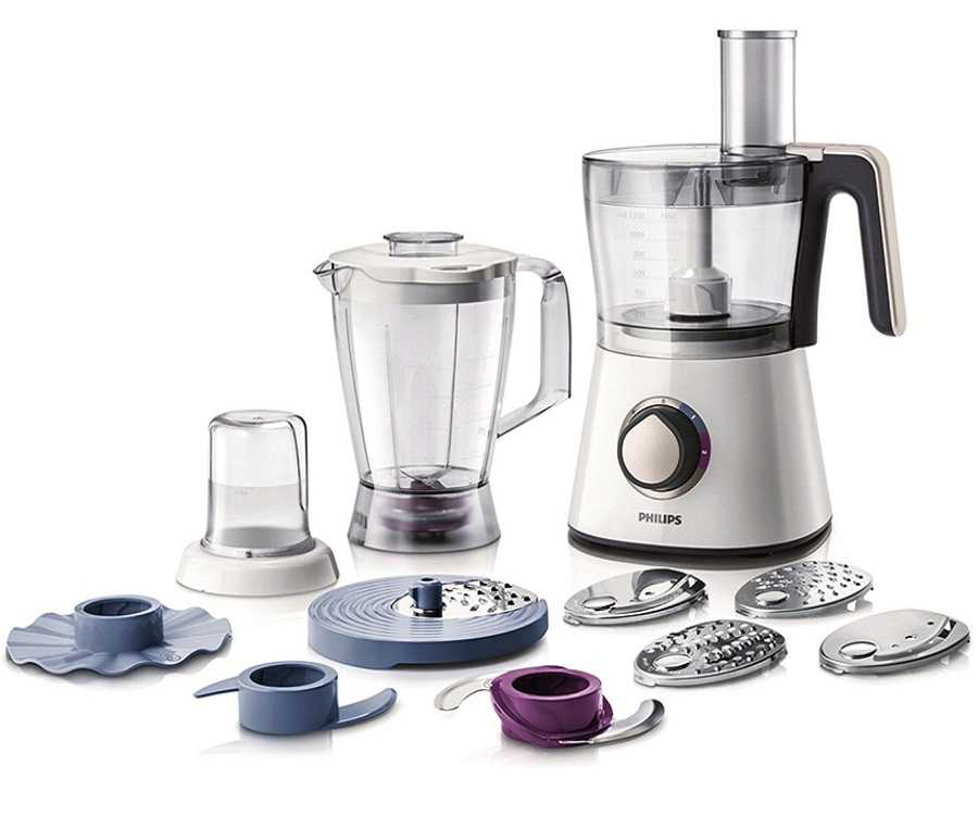 Двухскоростной кухонный комбайн с нарезкой кубиками и соломкой включает 8 насадок, среди которых: универсальный нож, эмульсионная насадка, тестомес, две тёрки, диск для нарезки. Компактный по габаритам, он способен смешивать, шинковать, миксовать и блендерить. Комплектация помещается в специально место для хранения.