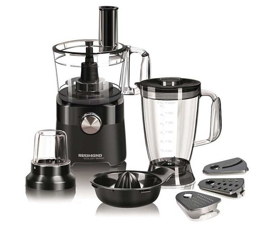 Открывает наш обзор кухонный комбайн с нарезкой кубиками Redmond RFP-3904 с чашей объемом 3,5 л. Этот агрегат сочетает в себе приборы для терки и шинковки продуктов в домашних условиях. В комплекте предусмотрено девять насадок различной формы и размера, в том числе для нарезки картофеля аккуратными ровными ломтиками для жарки во фритюре. Особенность устройства — возможность измельчения овощей в виде кубиков величиной 8 мм. Также с моделью поставляются два S-образных ножа: металлический и пластиковый. Все стальные элементы выполнены из нержавеющего материала. Для хранения деталей имеется специальный контейнер, который является частью моторного блока. В зависимости от плотности продуктов работа осуществляется на двух скоростях. Чтобы прибор сразу функционировал на максимальном уровне, необходимо установить импульсный режим. Комбайн Redmond RFP-3904 имеет встроенную защиту от перегрева при длительной нагрузке, а также от включения при неправильной установке емкости, что продлевает эксплуатационный срок службы модели. Прорезиненные ножки с присосками предотвращают вибрацию и падение устройства.