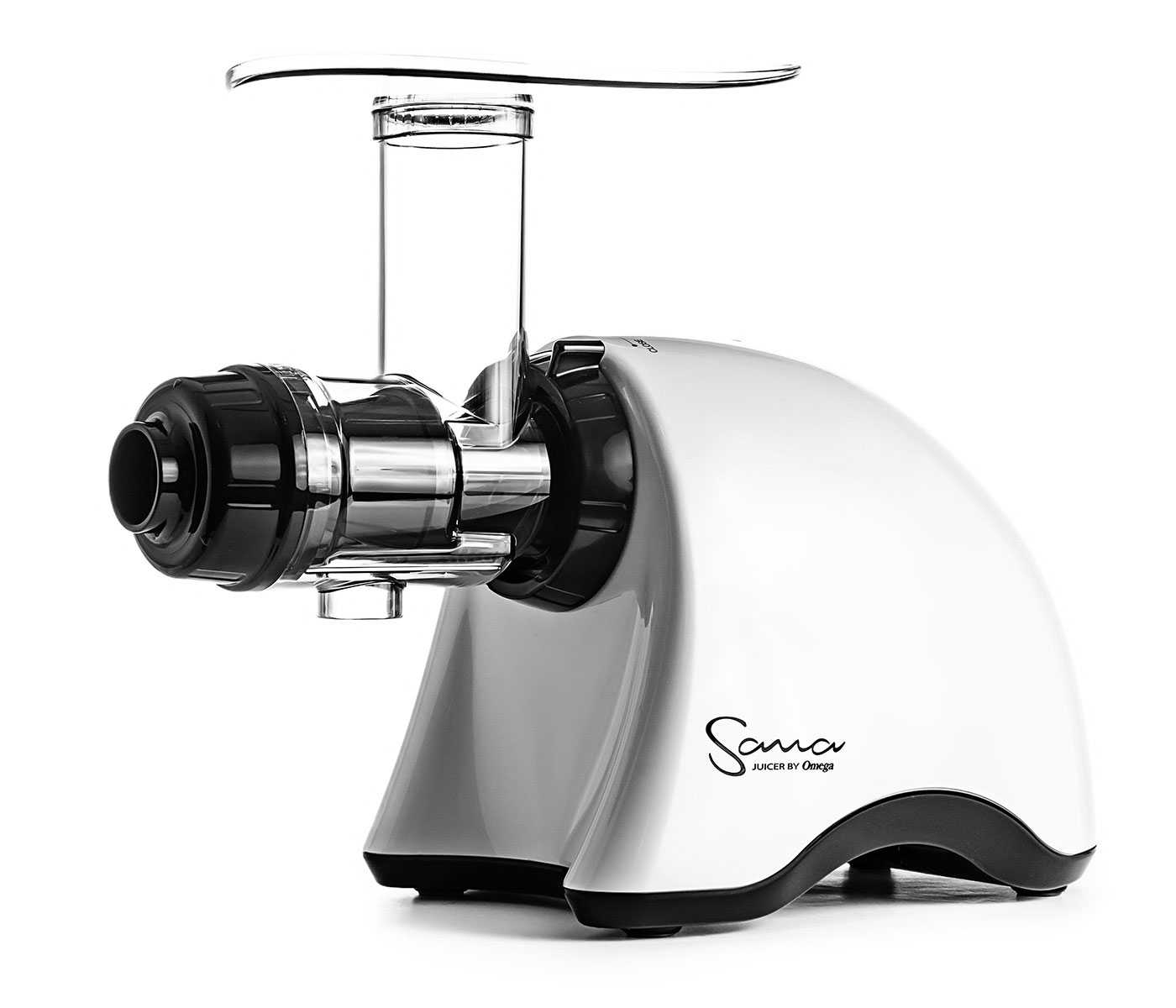 В комплекте много насадок, благодаря которым можно делать не только сок, а также пюре, лапшу, сорбет, ореховую пасту. Модель справляется с грушами, свеклой, морковью, гранатом, сельдереем, салатом, петрушкой, укропом. Жмых отделяется автоматически и измельчается специальной насадкой на выходе. Отжимная корзина из прозрачного пластика позволяет рассмотреть консистенцию плодов в ней. Уровень шума ниже, чем у многих аналогов.