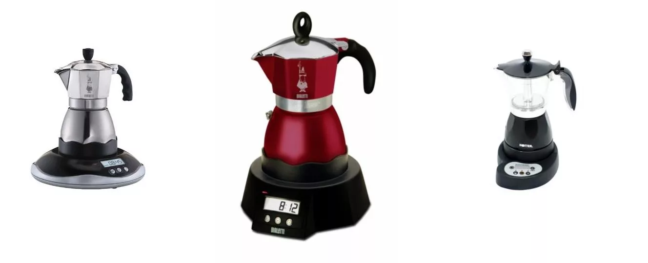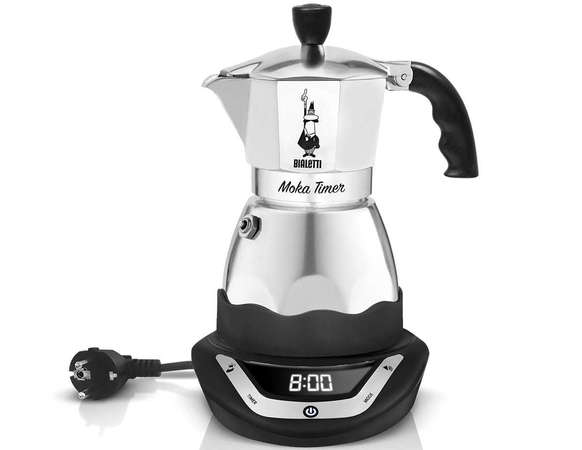 Итальянская компания Bialetti выпускает также и электрические гейзерные кофеварки. Также как и предыдущая модель устанавливается на автономною платформу. Классический дизайн гейзерных кофеварок с ребристой верхней частью. У данного прибора есть функция не только автоотключения, но и отложенного старта, что позволяет заранее запрограммировать приготовление кофе к нужному времени. Объем позволяет приготовить 6 чашек кофе за одну процедуру. Объем 0.24 л.