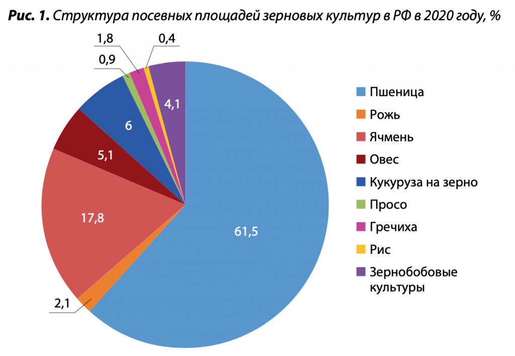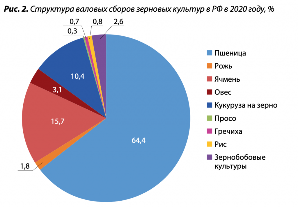 В течение последних 10 лет наблюдалась тенденция увеличения посевных площадей, валовых сборов и урожайности зерновых культур в РФ. Угодья, занятые ими, к 2020 году по сравнению со средним значением за 2010–2014 годы возросли на 7,3% и составили 47,9 млн га, валовые сборы — на 57,4%, то есть до 133,46 млн т, продуктивность — на 30%, или до 28,6 ц/га. Из всех зерновых наибольшие посевные территории в прошлом году традиционно приходились на пшеницу — 61,5%, ячмень — 17,8%, кукурузу на зерно — 6%. Валовые сборы соответствовали этим величинам.