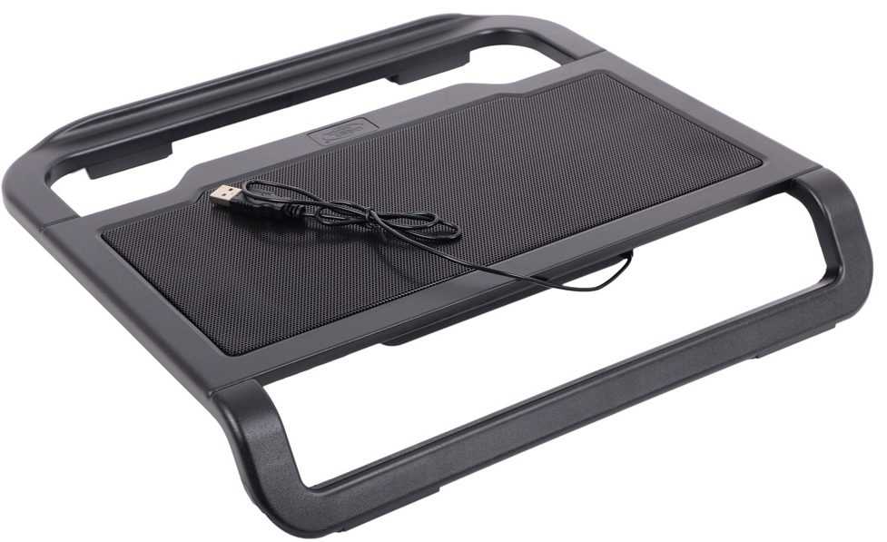 Если выбирать одну из самых дешёвых подставок для 17-дюймового ноутбука, то данное решение следует рассматривать в первую очередь. Простой с виду чёрный пластиковый корпус с большими вырезами по бокам оснащается одним 170-милимметровым вентилятором, который способен охлаждать даже мощные ноутбуки, предназначенные для игр. Ничего лишнего – только кулер, прикрытый металлической решёткой, и корпус соответствующей формы. Питание конструкции осуществляется через гнездо USB. Очень тихо шелестит за счёт наличия больших лопастей.