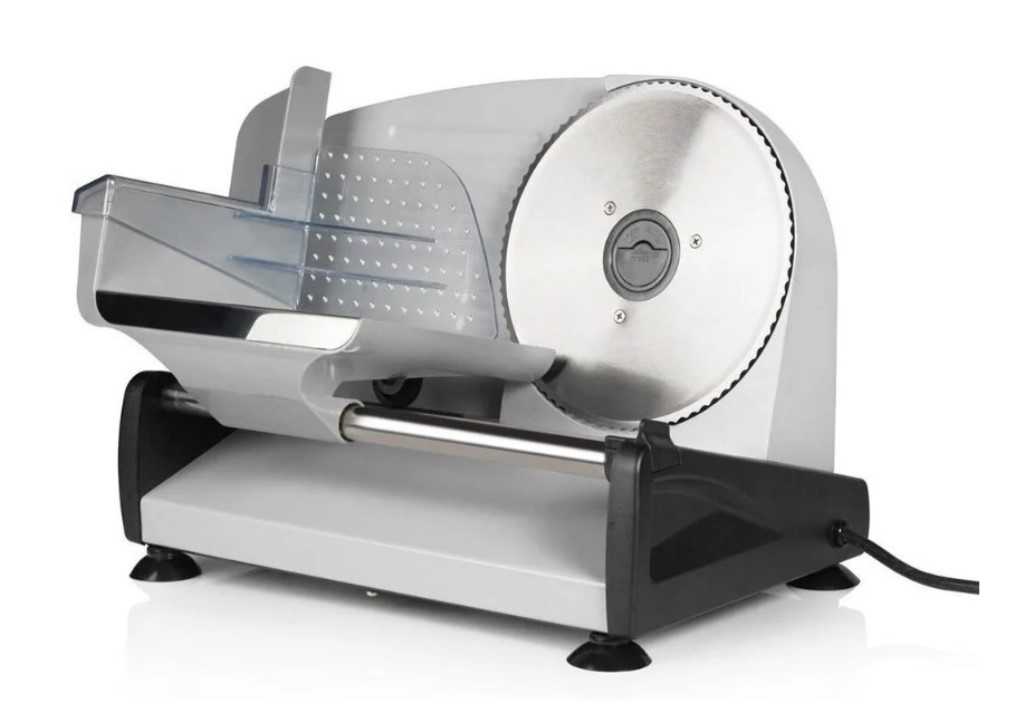 Нескользящие ножки обеспечивают высокую устойчивость и безопасность, а для быстрой остановки лезвия есть специальный предохранительный выключатель. Среди дополнительных особенностей модели – оптимальный наклон разделочной доски, металлический корпус и удобный держатель для продуктов.