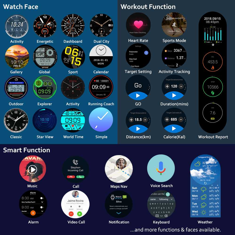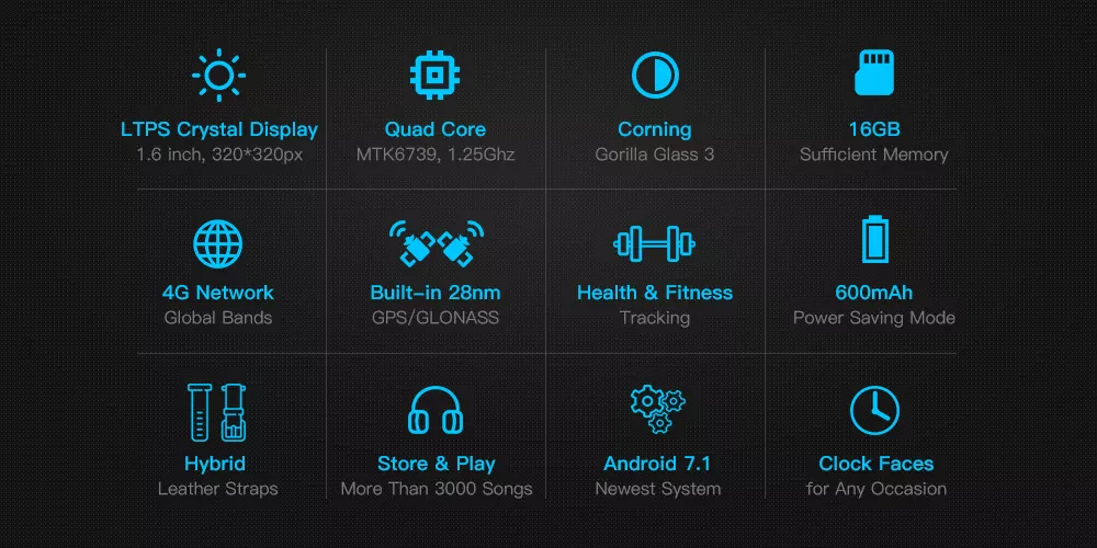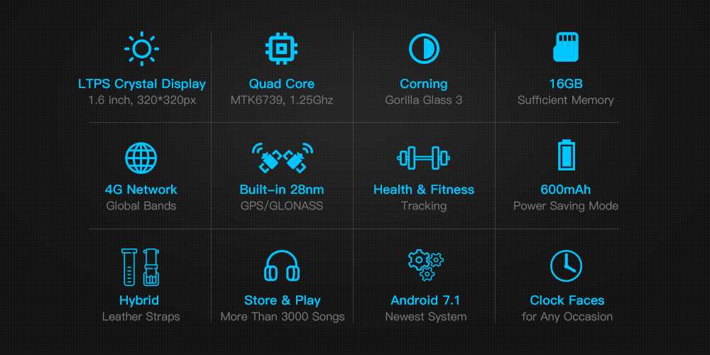 Функции:4G сеть (глобальная полоса), gps/ГЛОНАСС, Google Play, голосовой поиск, Автономная музыка,Wi-Fi, погода, лица часов для любого случая, приложения, лица и уведомления часов, телефонная книга, будильник, Bluetooth, браузер, календарь, камера, электронная книга, MP3, MP4, дополнительные, монитор сердечного ритма, шагомер, напоминание о звонках, удаленная музыка, уведомление о сообщениях, удаленная камера, ответ на вызов, вызов.