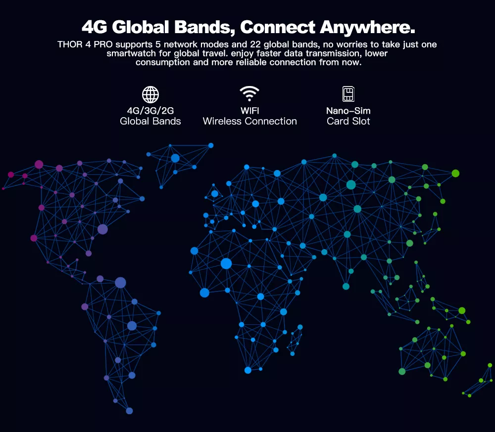 THOR 4 PRO поддерживает 5 режимов сети и 22 глобальной полосы, не беспокойтесь о том, чтобы взять только один Смарт-часы для глобальной путешествий. Наслаждайтесь более быстрой передачей данных, более низким потреблением и более надежным подключением с этого момента.