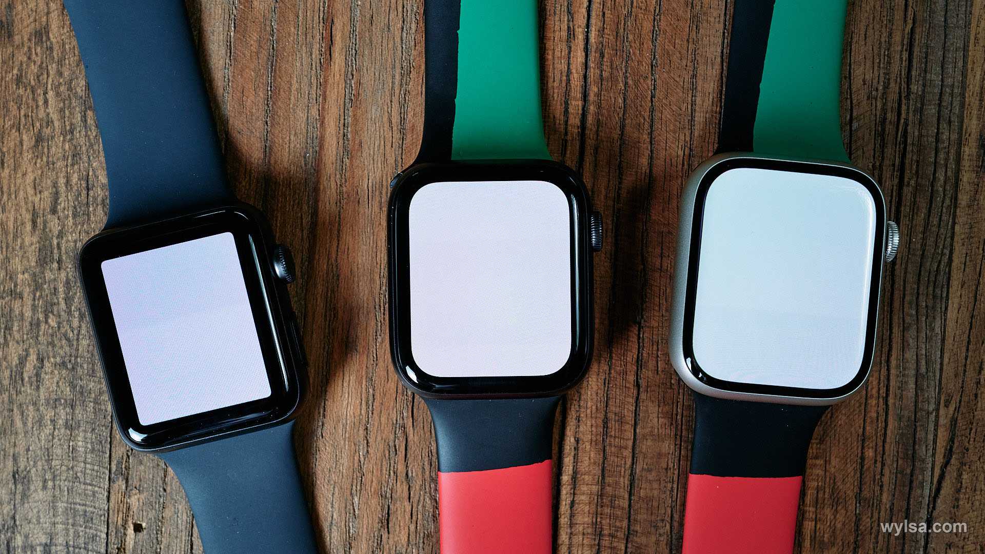 Сравнение экранов Apple Watch Series 3, SE и Series 7 соответственно. Фото: Илья Кичаев / Wylsacom Media