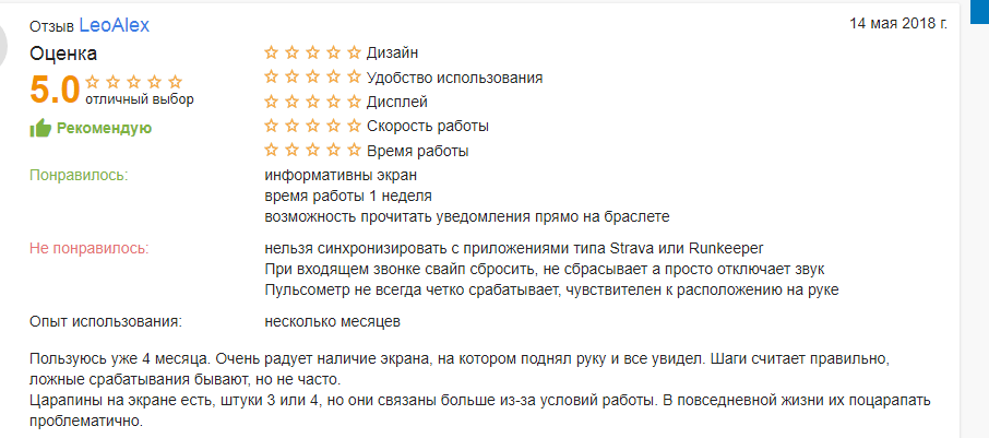 Браслет подойдет человеку, ведущему активный образ жизни и желающему получить хороший результат. Трекер отслеживает параметры активности и состояния сердечно-сосудистой системы. Все данные анализируются официальным приложением. Прибор надевают при занятии бегом, езде на велосипеде, плавании, туристических походах или фитнесе. Мягкий силиконовый ремешок не ощущается при ношении на руке. Широкий дисплей долговечен и удобен в использовании. Заряд держится не менее 8 часов, в режиме ожидания подключать зарядное устройство можно раз в 5 суток.