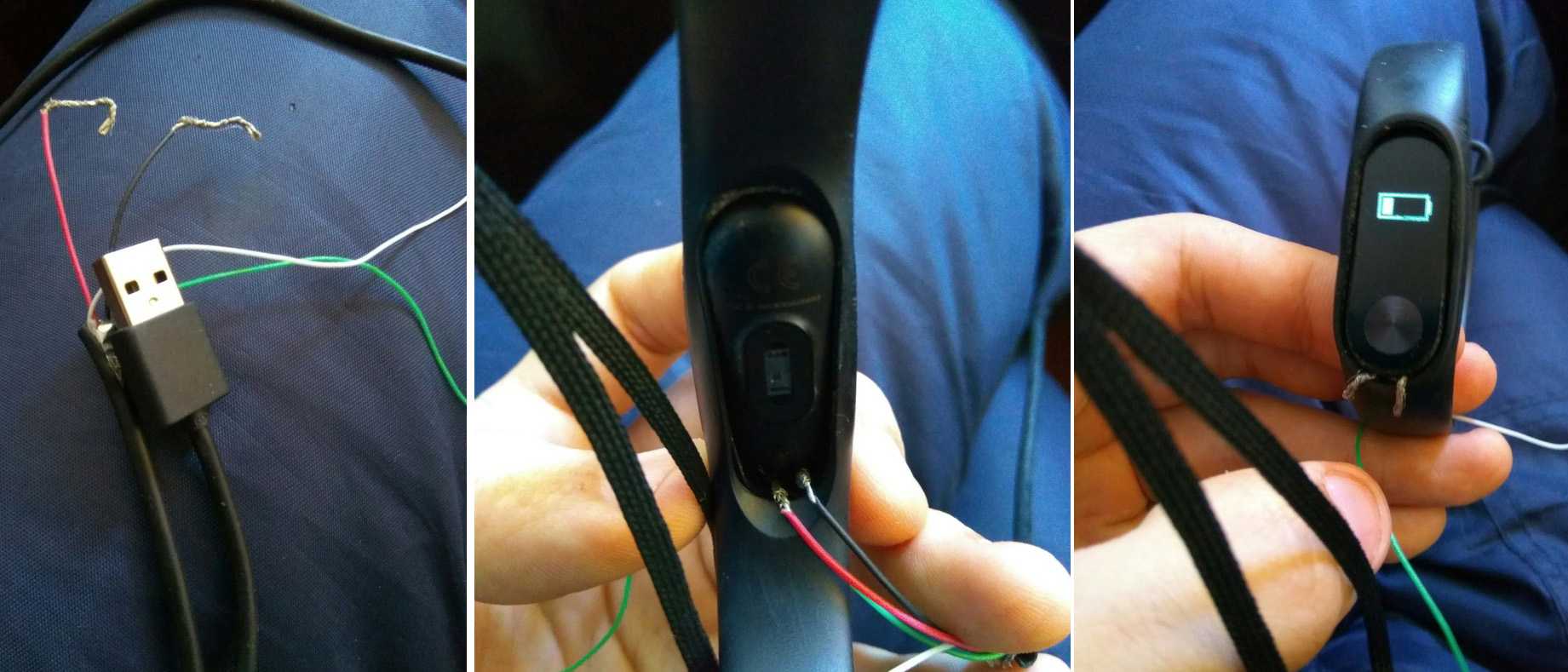 - Использовать USB-шнур с другого девайса. После этого разделайте черный и красный провод, а далее прижмите их к контактам браслета. Для надежности зафиксируйте соединение с помощью скрепок. В завершение подключите провод USB к ПК. Если все сделано правильно, начнется зарядка фитнес браслета Xiaomi.
