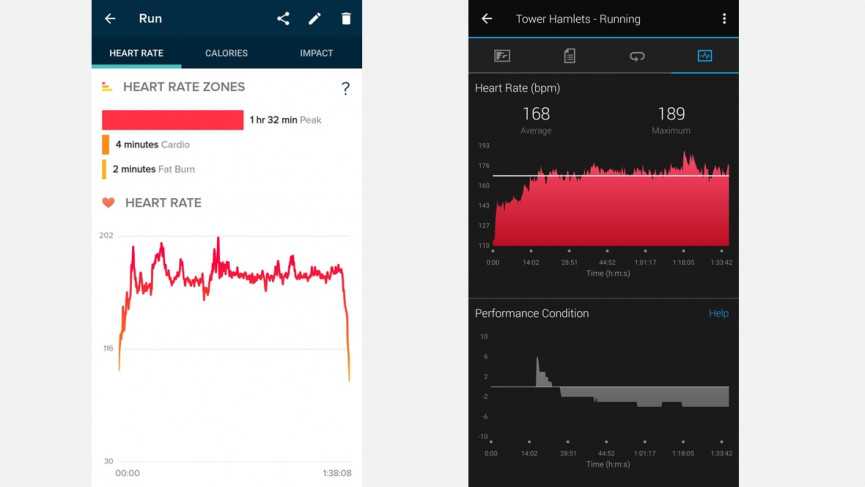 Трекеру также удалось сообщить о значительно более высоком максимальном показании сердечного ритма, достигнув отметки 200, когда во время гонки максимальная нагрузка на ремень достигла 189 ударов в минуту. Это еще один случай, когда его можно использовать для устойчивых тренировок, но он просто не подходит для тренировок с высокой интенсивностью и внезапных скачков и падений сердечного ритма.
