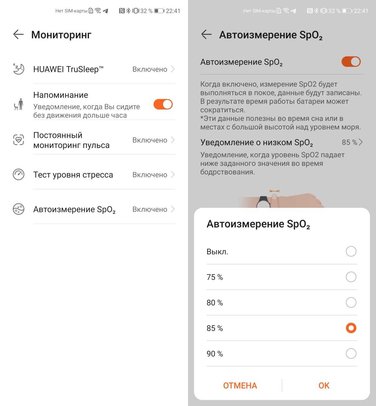 Huawei Band 6 умеет постоянно отслеживать уровень кислорода в крови. И это отличает его от собрата Honor Band 6. Однако постоянный мониторинг нужно отдельно активировать в настройках браслета. Делается это через приложение «Huawei Здоровье»: