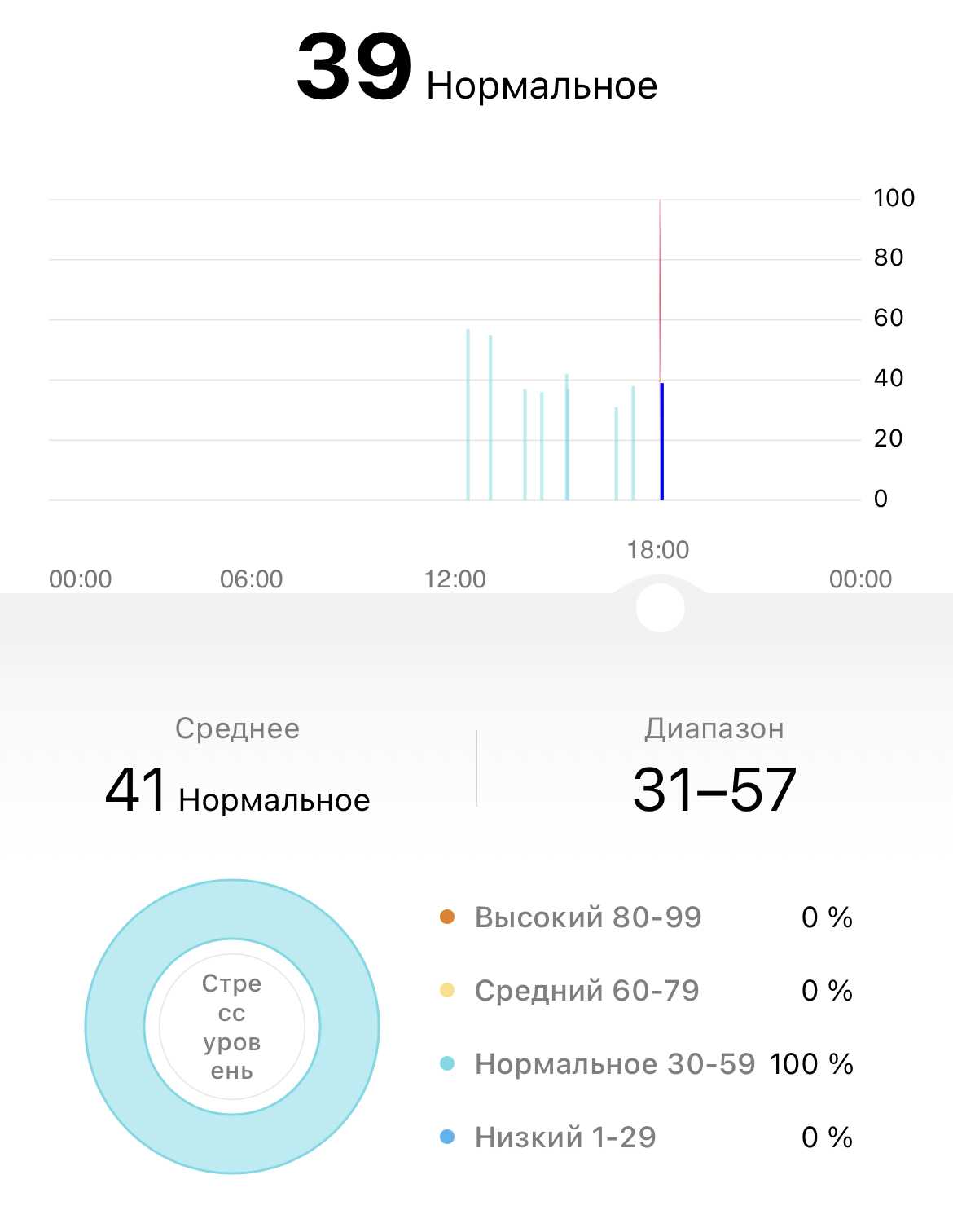 После двенадцати вопросов и с оглядкой на значения пульса браслет покажет значения вашего стресса. У меня, как говорит Band 6, всё нормально со стрессом: