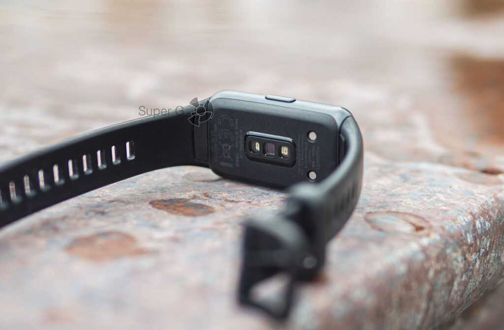 На тыловой части трекера расположен оптический пульсоксиметр для измерения пульса и насыщения крови кислородом, а также пины для магнитной зарядки.