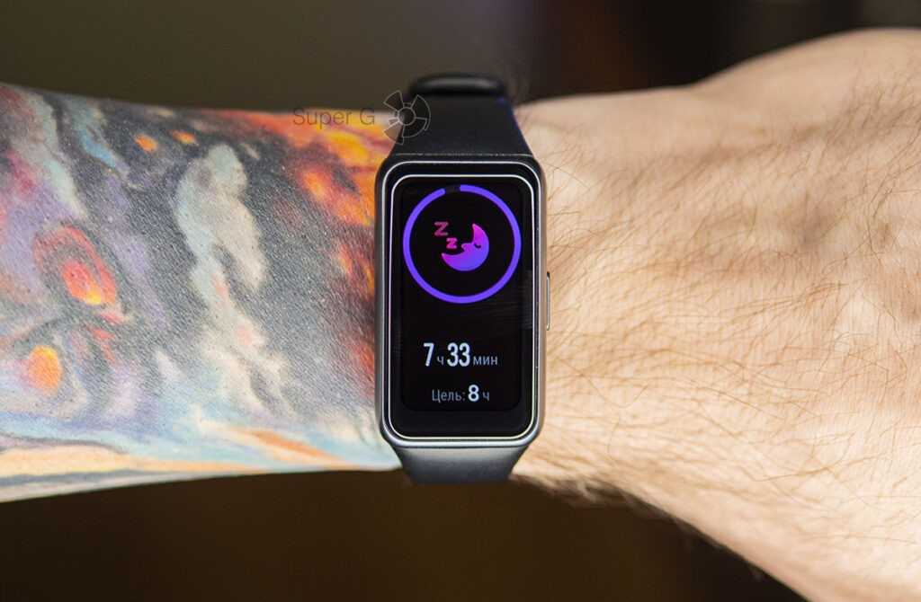 Huawei Band 6 пробуждается не по тапу по экрану, а по нажатию на боковую кнопку. Она тут, кстати, всего одна и возвращает вас на главный экран.