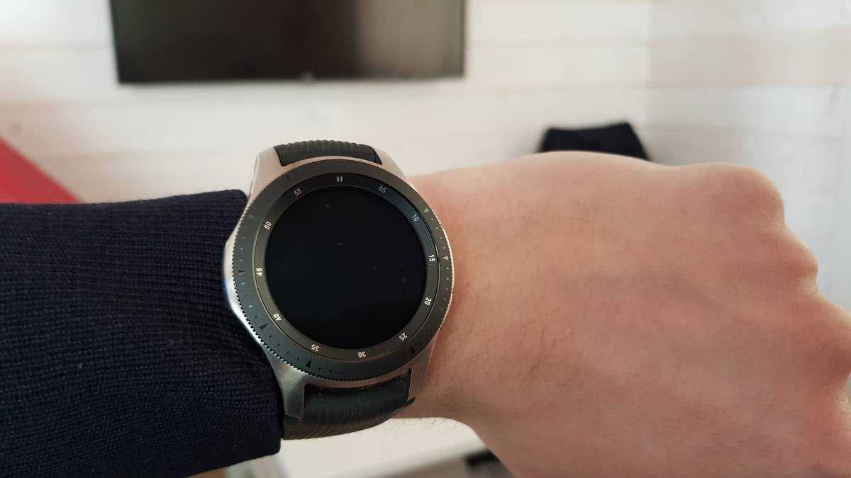 Одна из кнопок на боку позволяет вернуться к предыдущему экрану, а другая переключает к циферблату. Часы соответствуют военному стандарту MIL-STD-810G и водонепроницаемые до 5 атмосфер. Дисплей Samsung Galaxy Watch покрыт Gorilla Glass DX +. Он устойчив к царапинам, текст разборчивый в солнечные дни. Экран имеет диагональ 1,3 дюйма и выполнен по технологии Super AMOLED.