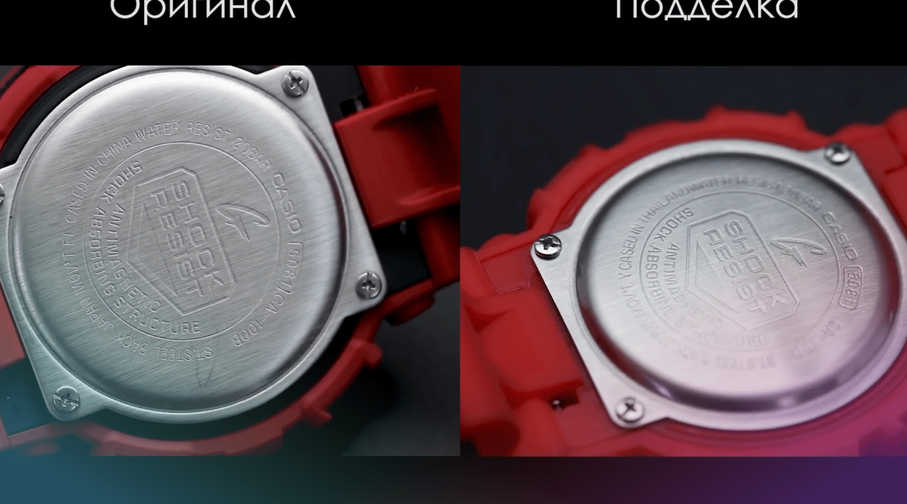 Фейки содержат текст, который как бы вдавлен в крышку. К тому же в нем могут присутствовать ошибки, которые сложно выявить. Так, в оригинале название модели G-Shock должно начинаться с GA 100CM. При этом в подделке оно может выглядеть как «CA 100CM».