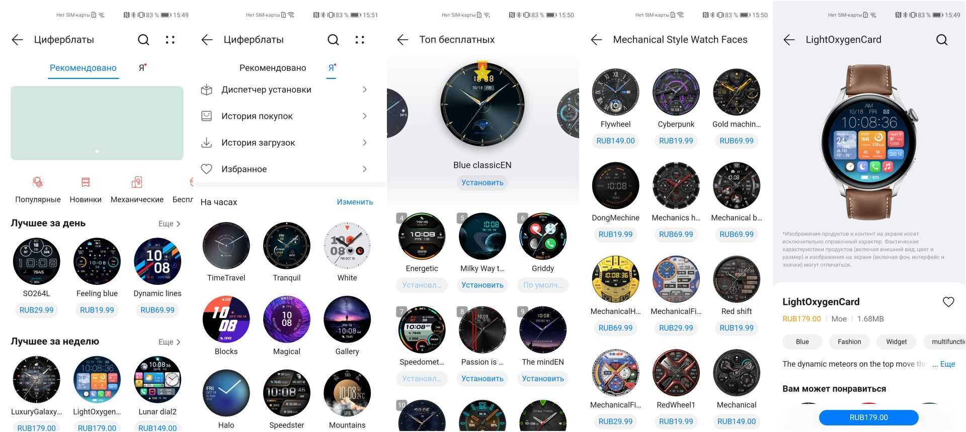 Тут, в принципе, все нормально. И время, и дату часы показывают. Все варианты циферблатов поддерживают только английский язык (хотя весь остальной интерфейс переведен на русский язык), поэтому день недели показывается на английском.