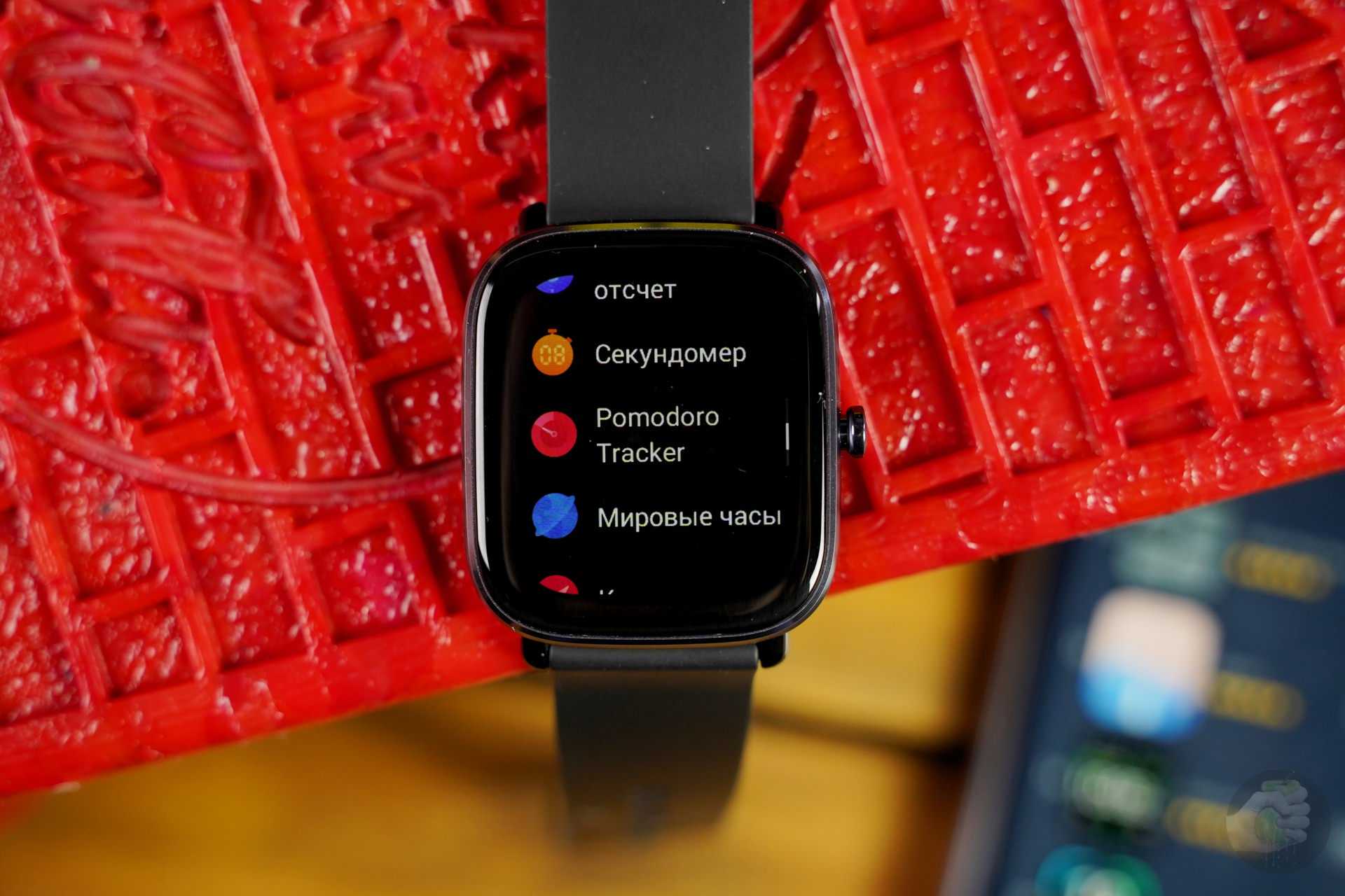 Поскольку часы работают на собственной платформе, то отдельных приложений для Amazfit GTS 2 нет. Однако предустановленных приложений для комфортной жизни достаточно: есть таймер, секундомер, будильник, мировые часы, погода, компас, функция поиска телефона и даже трекер Pomodoro для продуктивной работы.