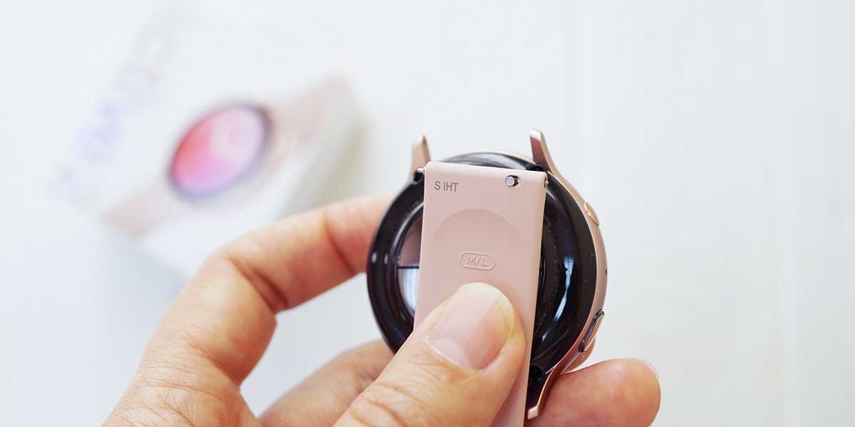 Ширина оригинального ремешка составляет 20 мм. При этом пользователь может заменить аксессуар на другой от сторонних брендов. Чтобы его установить, достаточно подтянуть небольшой рычажок.
