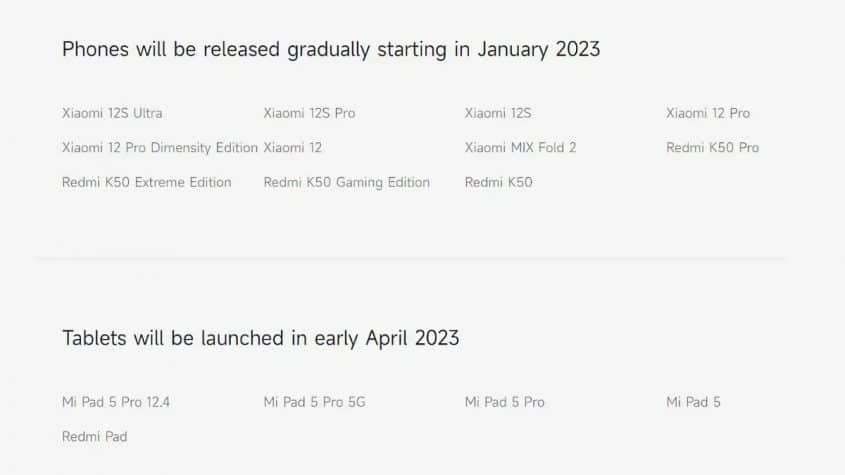 Небольшой список флагманов. Учитывая, что Xiaomi пообещала предоставлять до трёх лет обновлений своим новым смартфонам, более чем вероятно, что новая версия будет совместим со всеми устройствами, которые вышли на рынок в течение 2022 года, и теми, которые имеют ПЗУ на базе Android 12.